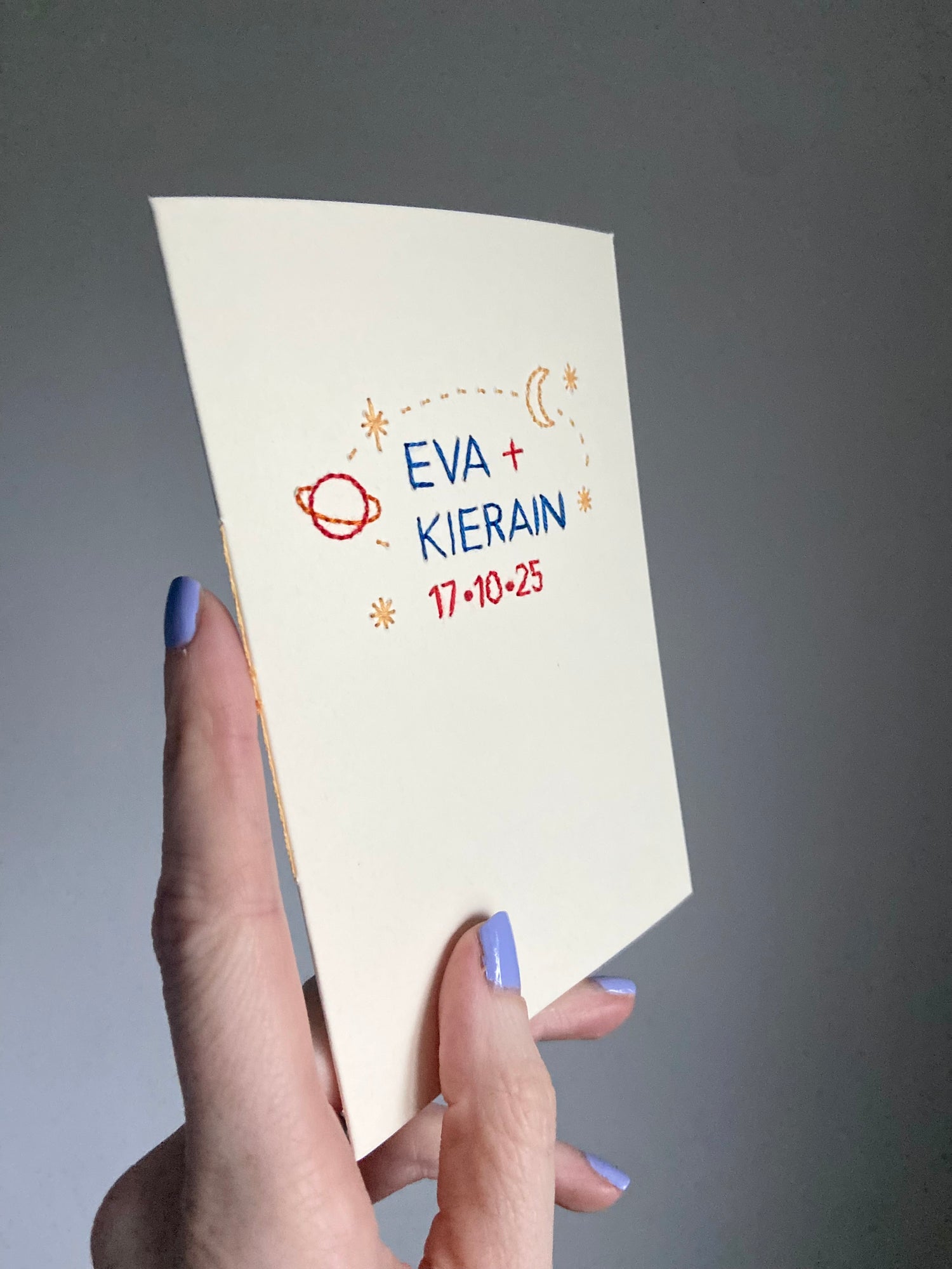 Hand-stitched personalised To the Moon + Back adorned with shooting stars, planet and a moon. The perfect card for any loved up occasion. Please write the couple’s names (two names - first name only) and date you would like stitched in the notes when placing your order. No two cards are the same, each card is lovingly and uniquely handmade. Made to order.